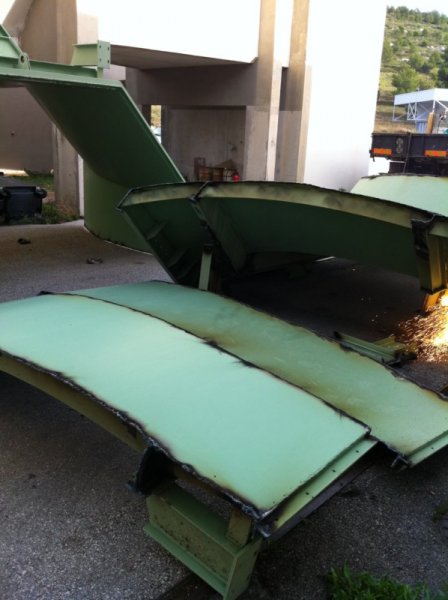Nous avons d'abord découper de gros morceaux pour les sortir du bâtiment puis nous les avons redécoupés à l'extérieur pour les enlever avec un camion griffe